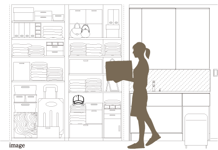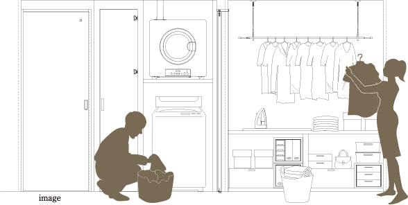 家族全員の衣類や日常使いのタオルを収納でき、各居室の収納まで運ぶ手間を削減。洗濯機の隣なので動線もスムーズ。アイロンがけもここで完結します。