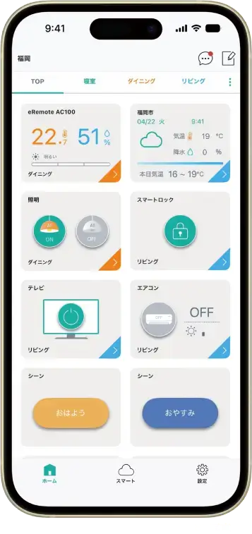 テレビなどの赤外線リモコン付き家電をスマートリモコンに登録すれば、スマホを使って操作可能です。