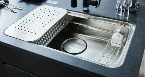 シンク内にある2段のレールに、2枚の水切りプレート、まな板を自由に配置でき、立体的に使用することで、調理や洗い物がスムーズに行える機能的なシンク。ステンレス素材で汚れが残りにくく、清潔な状態を保つことができます。洗剤置きもセットです。