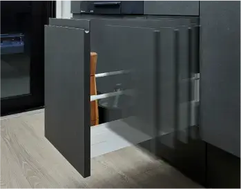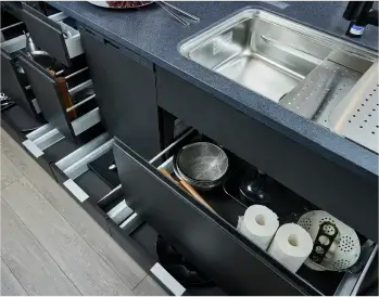 キッチンカウンター下収納はオールスライドタイプ。扉を開く必要が無いので、出し入れもスムーズ。