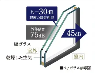 高めるペアガラス全居室の窓にはペアガラスを採用。結露の軽減と断熱効果や冷暖房効率の向上も期待できます。また遮音性も高く、外部からの騒音を軽減。快適で静かな暮らしを実現します。(T-2等級)